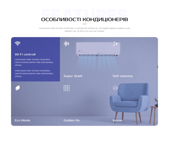 После товарного ассортимента приводится еще один блок с ключевыми возможностями каждого из кондиционеров в более подробной форме для подчеркивания преимуществ продукции перед конкурентами. Эта секция предназначена для дополнительного убеждения клиентов, которые еще колеблются и не могут сделать выбор в пользу компании AlpineAir.