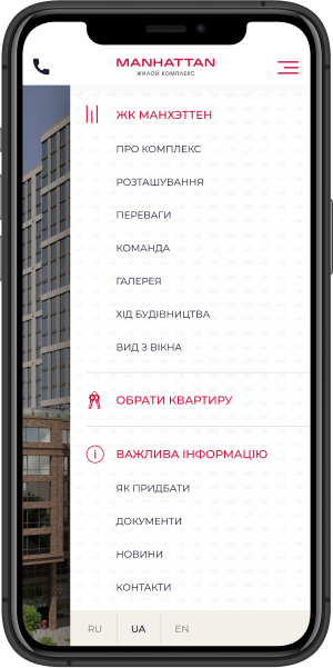 Создать презентационный сайт для строительного проекта жилого комплекса "Манхэттен" в Днепре. Основной задачей при реализации была максимально возможная презентация дома, разработка функционала подбора квартиры, просмотр расположения объекта, хода строительства и всей сопутствующей информации, а также привлечение потенциальных покупателей на обращение в отдел продаж.